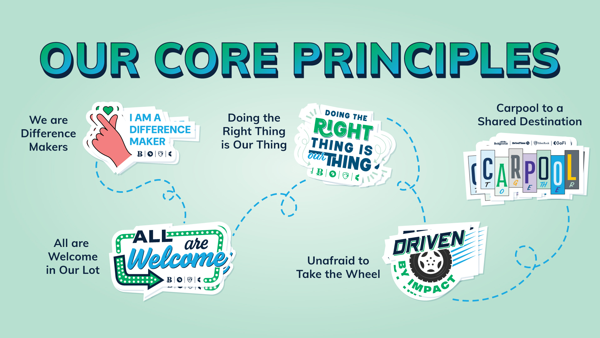 The University Relations team offers a summer internship program for the DriveTime family of brands. To attract students at career fairs, I translated our core principles into culturally inspired stickers that would resonate with the next generation of talent.