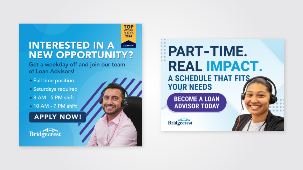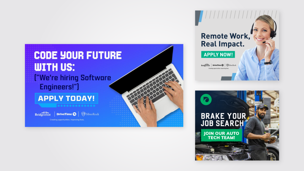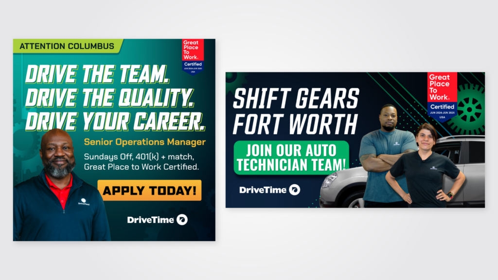 The drivetime family of brands consists of 4 companies with varying hiring needs. Our goal is to attract good candidates by improving the branding of our recruitment ads. The ads went live through third-party agencies with paid media campaigns and organic recruiter job postings.